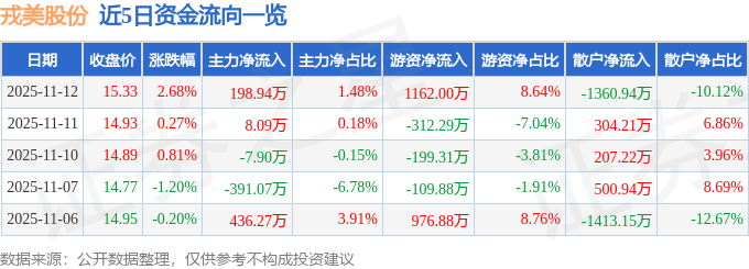 证券之星消息,截至2025年11月12日收盘,戎美股份(301088)报收于15.33元,上涨2.68%,换手率4.67%,成交量8.78万手,成交额1.34亿元。