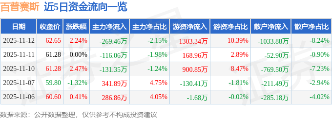 11月12日的资金流向数据方面,主力资金净流出269.46万元,占总成交额2.15%,游资资金净流入1303.34万元,占总成交额10.39%,散户资金净流出1033.88万元,占总成交额8.24%。