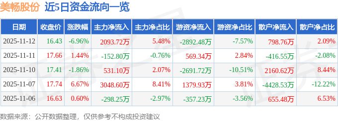 证券之星消息,截至2025年11月12日收盘,美畅股份(300861)报收于16.43元,下跌6.96%,换手率5.44%,成交量22.94万手,成交额3.82亿元。