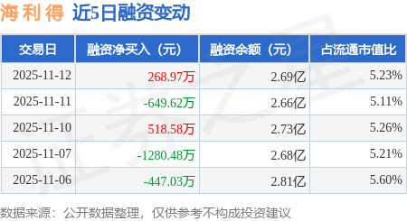 证券之星消息,11月12日,海 利 得(002206)融资买入1423.54万元,融资偿还1154.57万元,融资净买入268.97万元,融资余额2.69亿元。
