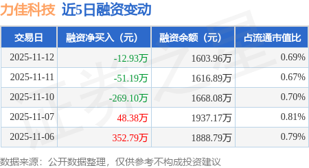 证券之星消息,11月12日,力佳科技(920237)融资买入186.07万元,融资偿还199.01万元,融资净卖出12.93万元,融资余额1603.96万元。
