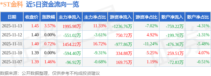 11月13日的资金流向数据方面,主力资金净流入1995.98万元,占总成交额11.33%,游资资金净流出1236.76万元,占总成交额7.02%,散户资金净流出759.22万元,占总成交额4.31%。