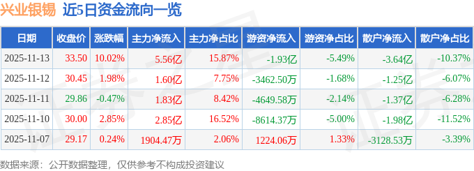 证券之星消息,兴业银锡11月13日涨停收盘,收盘价33.5元。该股于10点20分涨停,1次打开涨停,截止收盘封单资金为7564.68万元,占其流通市值0.13%。