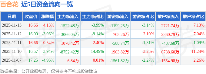 证券之星消息,截至2025年11月13日收盘,百合花(603823)报收于16.66元,上涨4.12%,换手率5.59%,成交量22.98万手,成交额3.82亿元。