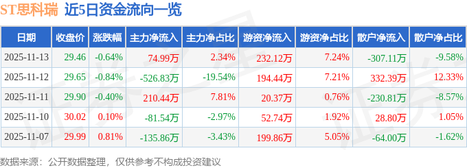 11月13日的资金流向数据方面,主力资金净流入74.99万元,占总成交额2.34%,游资资金净流入232.12万元,占总成交额7.24%,散户资金净流出307.11万元,占总成交额9.58%。