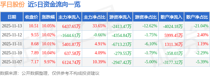 11月13日的资金流向数据方面,主力资金净流入6437.65万元,占总成交额33.65%,游资资金净流出2413.47万元,占总成交额12.62%,散户资金净流出4024.18万元,占总成交额21.04%。
