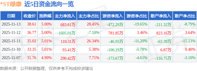 证券之星消息,截至2025年11月13日收盘,*ST绿康(002868)报收于38.61元,上涨5.0%,换手率0.41%,成交量6280.0手,成交额2403.19万元。