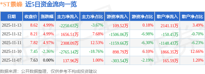 证券之星消息,截至2025年11月13日收盘,*ST景峰(000908)报收于8.62元,上涨4.99%,换手率8.17%,成交量71.9万手,成交额6.14亿元。