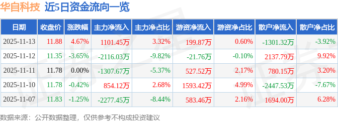 证券之星消息,截至2025年11月13日收盘,华自科技(300490)报收于11.88元,上涨4.67%,换手率7.12%,成交量28.02万手,成交额3.32亿元。