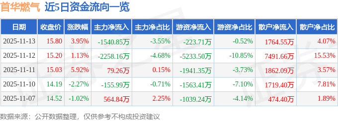 证券之星消息,截至2025年11月13日收盘,首华燃气(300483)报收于15.8元,上涨3.95%,换手率10.22%,成交量27.76万手,成交额4.34亿元。
