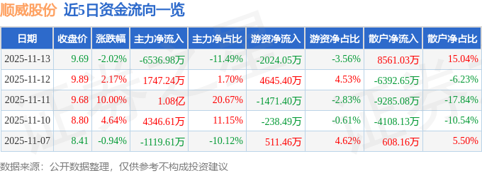 证券之星消息,截至2025年11月13日收盘,顺威股份(002676)报收于9.69元,下跌2.02%,换手率8.13%,成交量58.57万手,成交额5.69亿元。