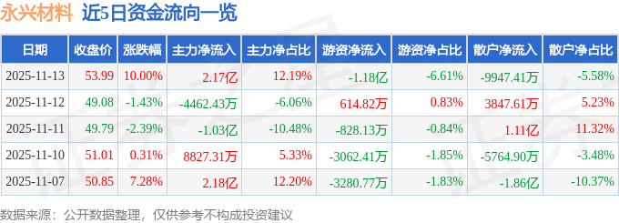 证券之星消息,永兴材料11月13日涨停收盘,收盘价53.99元。该股于10点30分涨停,8次打开涨停,截止收盘封单资金为1503.57万元,占其流通市值0.07%。
