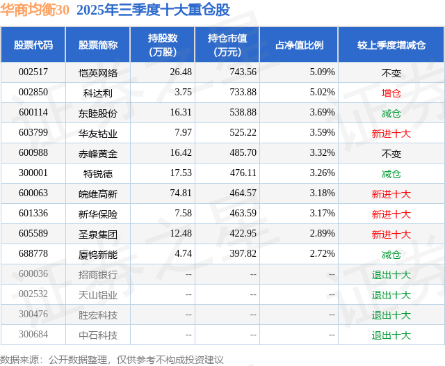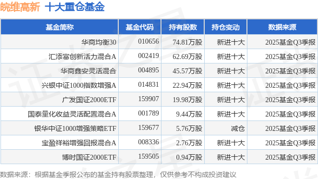 根据2025基金Q3季报公募基金重仓股数据,重仓该股的公募基金共9家,其中持有数量最多的公募基金为华商基金的华商均衡30。华商均衡30目前规模为1.46亿元,最新净值0.9208(11月12日),较上一交易日下跌0.24%,近一年上涨31.15%。该公募基金现任基金经理为陈恒。陈恒在任的基金产品包括:华商鑫安灵活混合,管理时间为2022年5月19日至今,期间收益率为33.43%;华商双驱优选混合,管理时间为2023年1月10日至今,期间收益率为28.28%;华商新常态混合A,管理时间为2025年1月6日至今,期间收益率为36.32%。