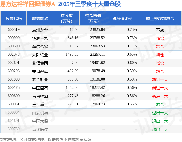 根据2025基金Q3季报公募基金重仓股数据,重仓该股的公募基金共50家,其中持有数量最多的公募基金为易方达基金的易方达裕祥回报债券A。易方达裕祥回报债券A目前规模为299.27亿元,最新净值1.631(11月12日),较上一交易日上涨0.06%,近一年上涨6.54%。该公募基金现任基金经理为王晓晨 王丹。王晓晨在任的基金产品包括:易方达增强回报债券A,管理时间为2011年8月15日至今,期间收益率为183.36%;易方达投资级信用债债券A,管理时间为2013年9月10日至今,期间收益率为76.52%;易方达安泽180天持有期债券A,管理时间为2024年1月24日至今,期间收益率为5.11%。王丹在任的基金产品包括:易方达高等级信用债债券A,管理时间为2024年6月29日至今,期间收益率为3.86%;易方达安嘉30天持有债券A,管理时间为2024年12月11日至今,期间收益率为1.9%;易方达恒兴3个月定开债,管理时间为2025年7月17日至今,期间收益率为0.28%。