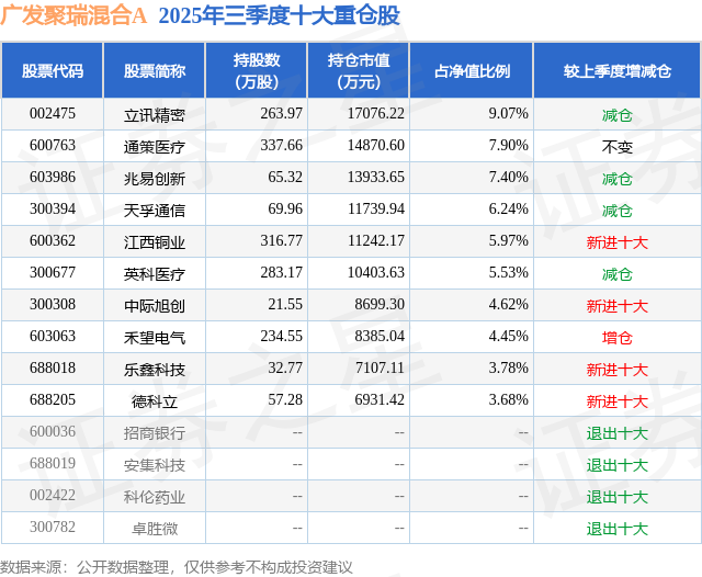 根据2025基金Q3季报公募基金重仓股数据,重仓该股的公募基金共19家,其中持有数量最多的公募基金为广发基金的广发聚瑞混合A。广发聚瑞混合A目前规模为18.1亿元,最新净值5.0762(11月12日),较上一交易日上涨0.49%,近一年上涨34.02%。该公募基金现任基金经理为费逸。费逸在任的基金产品包括:广发鑫益混合,管理时间为2018年8月2日至今,期间收益率为233.2%;广发瑞安精选股票A,管理时间为2020年12月16日至今,期间收益率为21.33%;广发盛兴混合A,管理时间为2021年2月2日至今,期间收益率为16.87%。