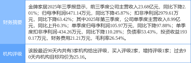 2025年10月31日,中国银河研究员陈柏儒,韩勉发布了对金牌家居的研报《业绩短期承压,看好长期战略定力》,该研报对金牌家居给出“买入”评级。研报中预计公司2025/2026/2027年EPS分别为1.0/1.3/1.6元,10月29日收盘价20.15元对应PE为21X/16X/13X,维持“推荐”评级。证券之星数据中心根据近三年发布的研报数据计算,该研报作者对此股的盈利预测准确度为42.31%。