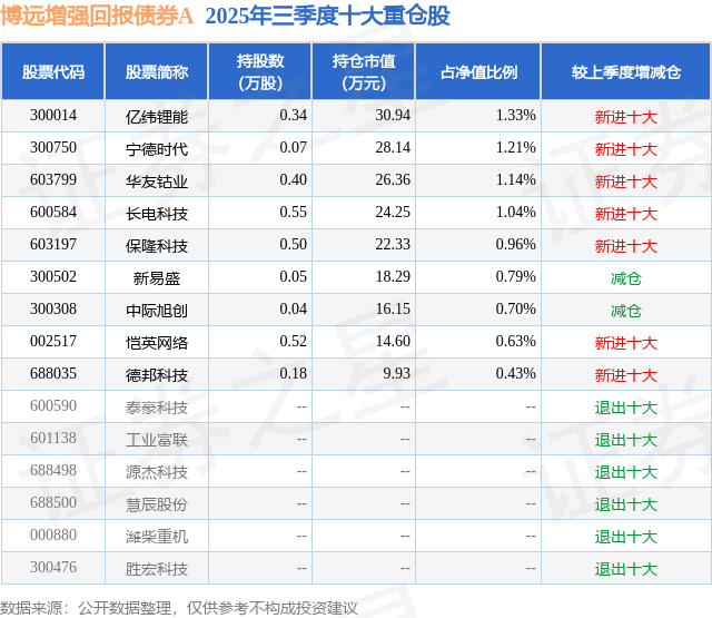 根据2025基金Q3季报公募基金重仓股数据,重仓该股的公募基金共1家,其中持有数量最多的公募基金为博远基金的博远增强回报债券A。博远增强回报债券A目前规模为0.11亿元,最新净值0.9633(11月12日),较上一交易日下跌0.25%,近一年上涨5.62%。该公募基金现任基金经理为钟鸣远 张星。钟鸣远在任的基金产品包括:博远臻享3个月定开债券A,管理时间为2021年12月13日至今,期间收益率为13.06%;博远增裕利率债A,管理时间为2023年11月24日至今,期间收益率为7.16%;博远增汇纯债债券A,管理时间为2024年8月12日至今,期间收益率为2.37%。