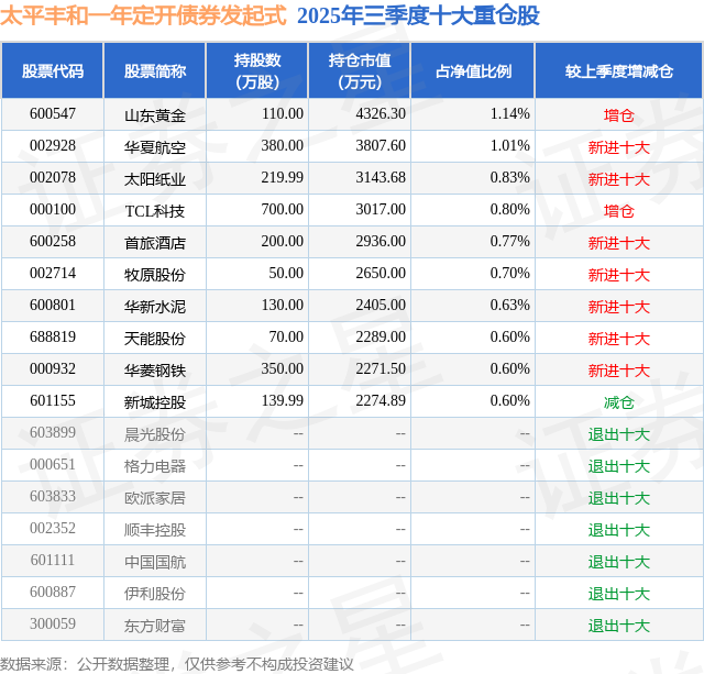太平丰和一年定开债券发起式的前十大重仓股如下: