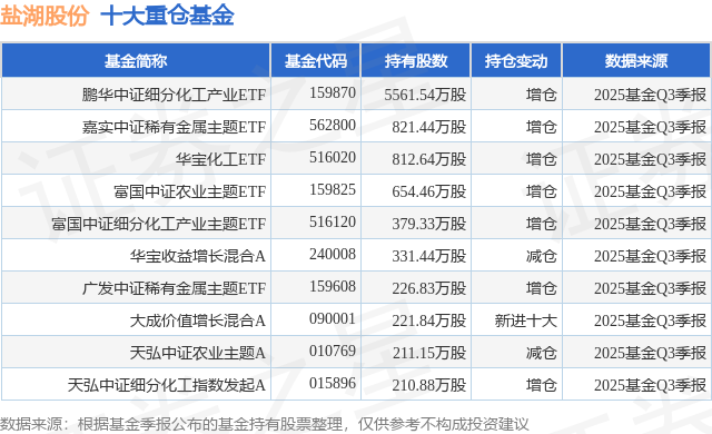 根据2025基金Q3季报公募基金重仓股数据,重仓该股的公募基金共57家,其中持有数量最多的公募基金为鹏华基金的鹏华中证细分化工产业ETF。鹏华中证细分化工产业ETF目前规模为185.44亿元,最新净值0.7663(11月12日),较上一交易日下跌0.36%,近一年上涨21.65%。该公募基金现任基金经理为闫冬。闫冬在任的基金产品包括:鹏华中证800地产指数(LOF)A,管理时间为2019年4月30日至今,期间收益率为-35.37%;鹏华中证A股资源产业指数(LOF)A,管理时间为2019年11月20日至今,期间收益率为160.65%;鹏华中证光伏产业ETF,管理时间为2021年2月22日至今,期间收益率为6.84%;