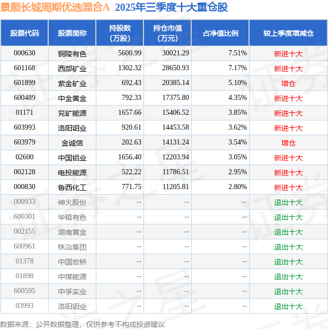 根据2025基金Q3季报公募基金重仓股数据,重仓该股的公募基金共35家,其中持有数量最多的公募基金为景顺长城基金的景顺长城周期优选混合A。景顺长城周期优选混合A目前规模为12.16亿元,最新净值1.8425(11月12日),较上一交易日上涨0.36%,近一年上涨57.98%。该公募基金现任基金经理为邹立虎。邹立虎在任的基金产品包括:景顺长城安盈回报一年持有混合A,管理时间为2021年11月16日至今,期间收益率为44.66%;景顺长城景盛双息收益债券A,管理时间为2022年1月29日至今,期间收益率为23.3%;景顺景颐招利6个月持有期债券A,管理时间为2022年3月12日至今,期间收益率为27.43%;景顺长城华城稳健6个月持有期混合A,管理时间为2022年3月12日至今,期间收益率为31.77%。