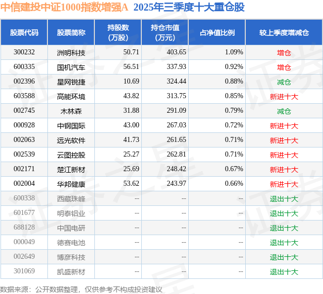中信建投中证1000指数增强A的前十大重仓股如下: