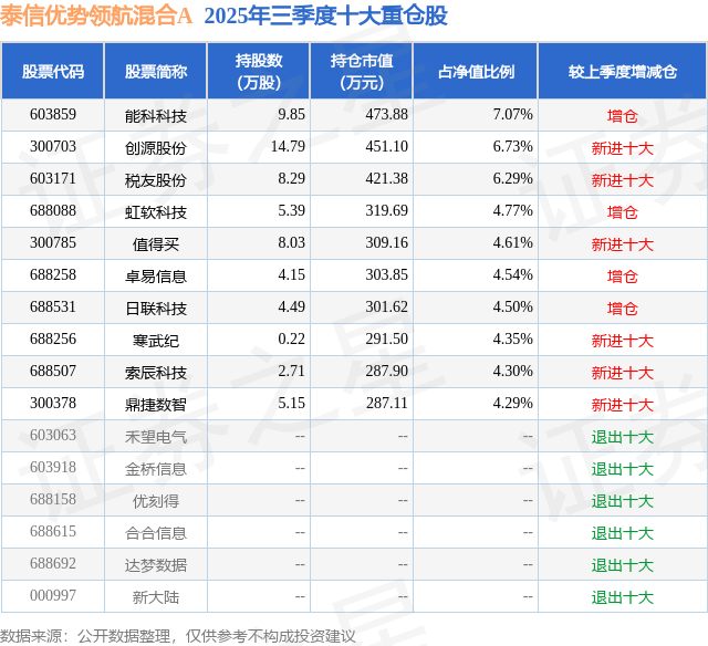根据2025基金Q3季报公募基金重仓股数据,重仓该股的公募基金共2家,其中持有数量最多的公募基金为泰信基金的泰信优势领航混合A。泰信优势领航混合A目前规模为0.18亿元,最新净值1.043(11月12日),较上一交易日下跌0.41%,近一年上涨16.02%。该公募基金现任基金经理为吴秉韬。吴秉韬在任的基金产品包括:泰信国策驱动灵活配置混合,管理时间为2019年7月25日至今,期间收益率为189.78%;泰信优质生活混合,管理时间为2021年10月12日至今,期间收益率为-32.29%;泰信低碳经济混合发起式A,管理时间为2021年11月3日至今,期间收益率为-3.82%;