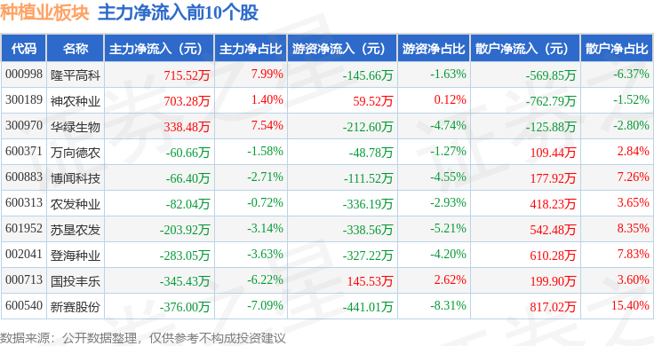从资金流向上来看,当日种植业板块主力资金净流出1.55亿元,游资资金净流入508.87万元,散户资金净流入1.5亿元。种植业板块个股资金流向见下表: