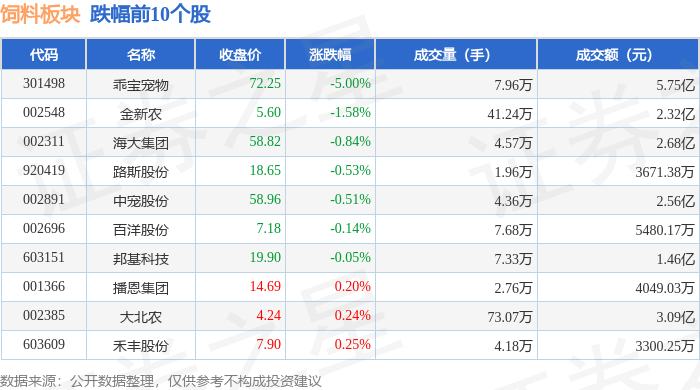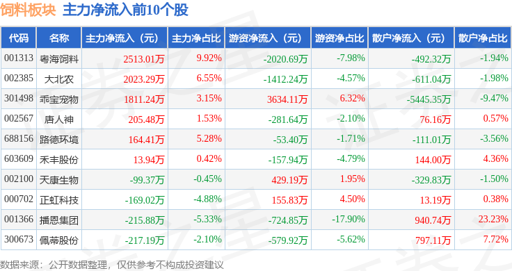 从资金流向上来看,当日饲料板块主力资金净流出4910.41万元,游资资金净流入2489.2万元,散户资金净流入2421.21万元。饲料板块个股资金流向见下表: