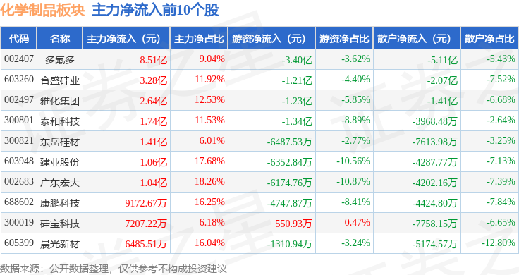 从资金流向上来看,当日化学制品板块主力资金净流入18.59亿元,游资资金净流出9.4亿元,散户资金净流出9.19亿元。化学制品板块个股资金流向见下表: