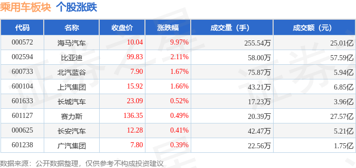 从资金流向上来看,当日乘用车板块主力资金净流入13.55亿元,游资资金净流出8.25亿元,散户资金净流出5.3亿元。乘用车板块个股资金流向见下表: