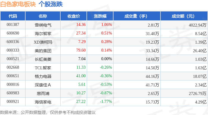 证券之星消息,11月13日白色家电板块较上一交易日上涨0.02%,雪祺电气领涨。当日上证指数报收于4029.5,上涨0.73%。深证成指报收于13476.52,上涨1.78%。白色家电板块个股涨跌见下表: