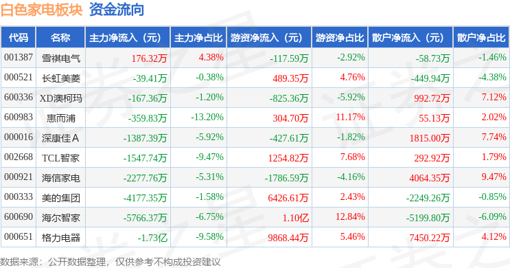 从资金流向上来看,当日白色家电板块主力资金净流出3.29亿元,游资资金净流入2.62亿元,散户资金净流入6712.62万元。白色家电板块个股资金流向见下表:
