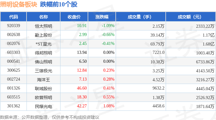 证券之星消息,11月13日照明设备板块较上一交易日上涨1.4%,立达信领涨。当日上证指数报收于4029.5,上涨0.73%。深证成指报收于13476.52,上涨1.78%。照明设备板块个股涨跌见下表: