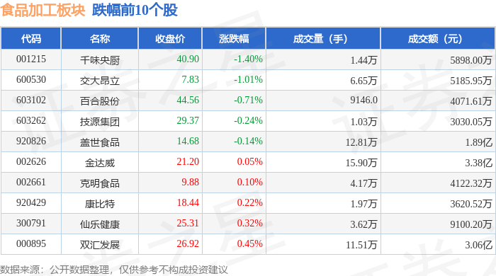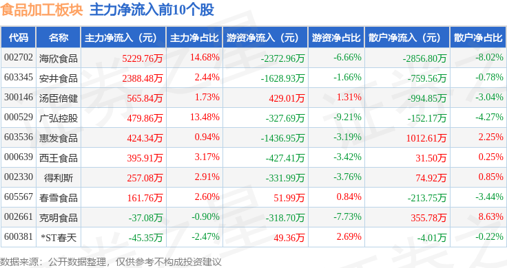 从资金流向上来看,当日食品加工板块主力资金净流出1207.77万元,游资资金净流出3416.02万元,散户资金净流入4623.79万元。食品加工板块个股资金流向见下表:
