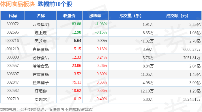 从资金流向上来看,当日休闲食品板块主力资金净流出1.54亿元,游资资金净流出9375.3万元,散户资金净流入2.48亿元。休闲食品板块个股资金流向见下表: