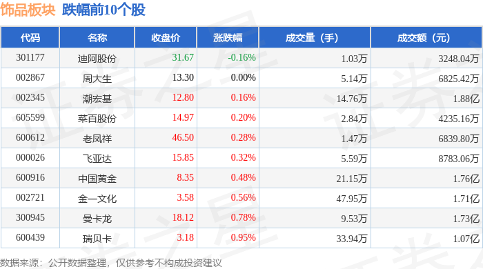 证券之星消息,11月13日饰品板块较上一交易日上涨0.47%,萃华珠宝领涨。当日上证指数报收于4029.5,上涨0.73%。深证成指报收于13476.52,上涨1.78%。饰品板块个股涨跌见下表: