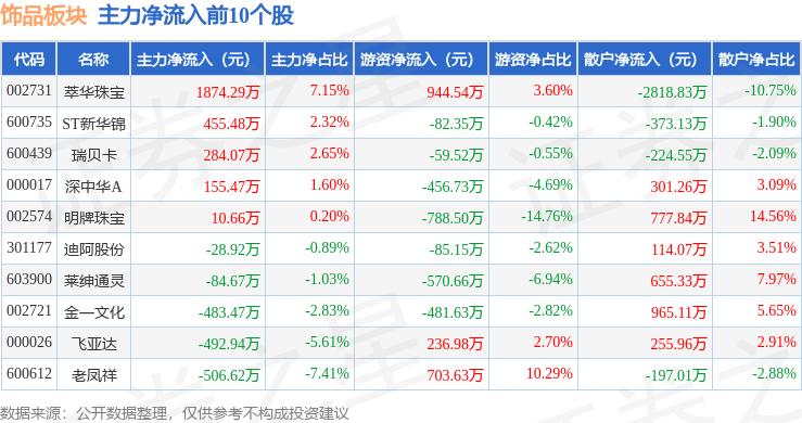从资金流向上来看,当日饰品板块主力资金净流出5600.1万元,游资资金净流出1558.24万元,散户资金净流入7158.34万元。饰品板块个股资金流向见下表: