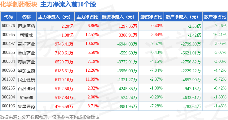 从资金流向上来看,当日化学制药板块主力资金净流入3.09亿元,游资资金净流出2.98亿元,散户资金净流出1115.87万元。化学制药板块个股资金流向见下表: