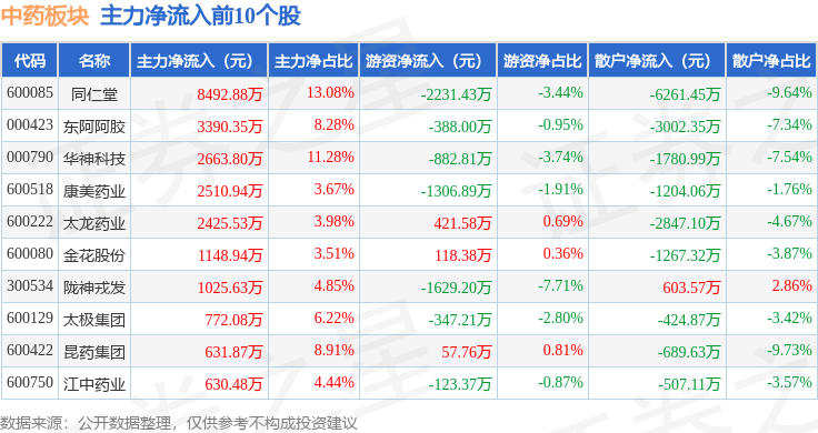 从资金流向上来看,当日中药板块主力资金净流出6.81亿元,游资资金净流入1.58亿元,散户资金净流入5.23亿元。中药板块个股资金流向见下表: