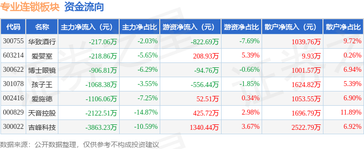 从资金流向上来看,当日专业连锁板块主力资金净流出9502.91万元,游资资金净流入553.71万元,散户资金净流入8949.2万元。专业连锁板块个股资金流向见下表: