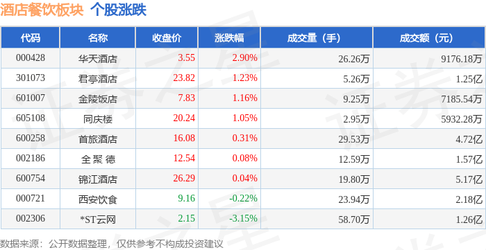 证券之星消息,11月13日酒店餐饮板块较上一交易日上涨0.36%,华天酒店领涨。当日上证指数报收于4029.5,上涨0.73%。深证成指报收于13476.52,上涨1.78%。酒店餐饮板块个股涨跌见下表: