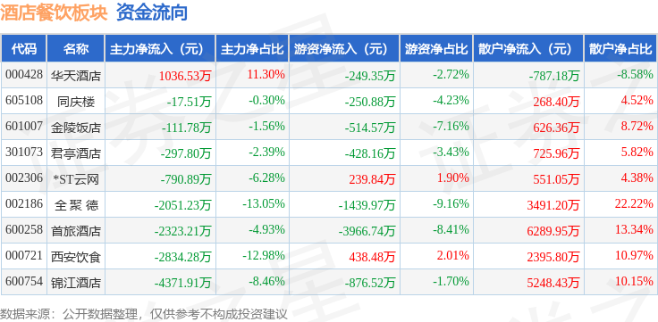 从资金流向上来看,当日酒店餐饮板块主力资金净流出1.18亿元,游资资金净流出7047.89万元,散户资金净流入1.88亿元。酒店餐饮板块个股资金流向见下表: