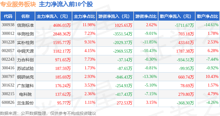 从资金流向上来看,当日专业服务板块主力资金净流入2978.77万元,游资资金净流出4944.47万元,散户资金净流入1965.7万元。专业服务板块个股资金流向见下表: