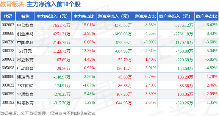 从资金流向上来看,当日教育板块主力资金净流入3728.86万元,游资资金净流出1458.53万元,散户资金净流出2270.33万元。教育板块个股资金流向见下表: