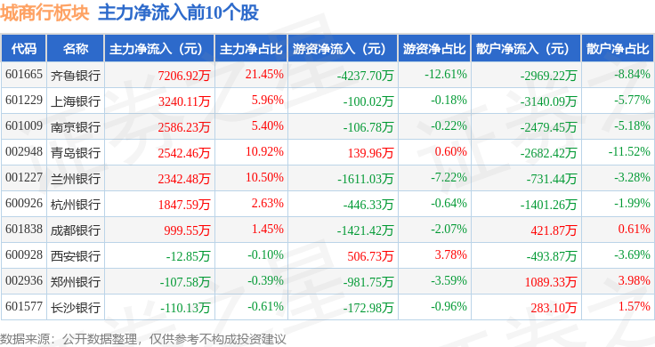 从资金流向上来看,当日城商行板块主力资金净流出6796.93万元,游资资金净流入1.67亿元,散户资金净流出9932.93万元。城商行板块个股资金流向见下表: