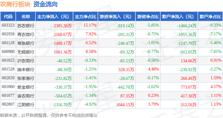 从资金流向上来看,当日农商行板块主力资金净流入4475.12万元,游资资金净流出551.33万元,散户资金净流出3923.79万元。农商行板块个股资金流向见下表: