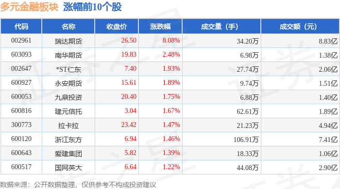 证券之星消息,11月13日多元金融板块较上一交易日上涨0.92%,瑞达期货领涨。当日上证指数报收于4029.5,上涨0.73%。深证成指报收于13476.52,上涨1.78%。多元金融板块个股涨跌见下表: