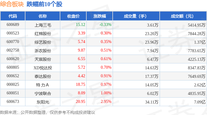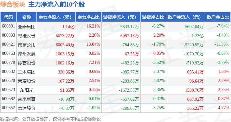 从资金流向上来看,当日综合板块主力资金净流入2.2亿元,游资资金净流出5023.79万元,散户资金净流出1.7亿元。综合板块个股资金流向见下表: