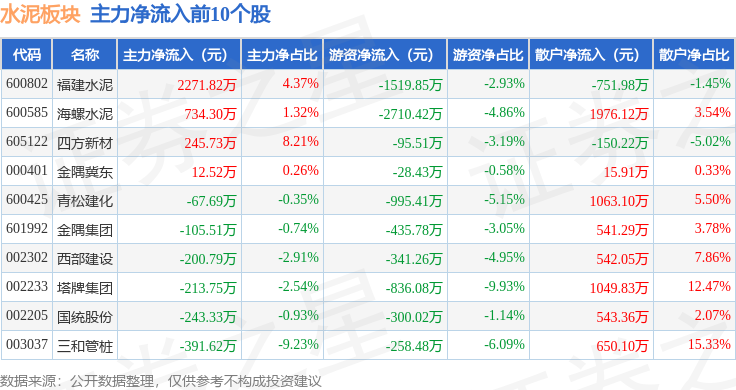 从资金流向上来看,当日水泥板块主力资金净流出1.34亿元,游资资金净流出1.21亿元,散户资金净流入2.55亿元。水泥板块个股资金流向见下表: