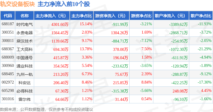 从资金流向上来看,当日轨交设备板块主力资金净流出1.67亿元,游资资金净流入6158.67万元,散户资金净流入1.06亿元。轨交设备板块个股资金流向见下表: